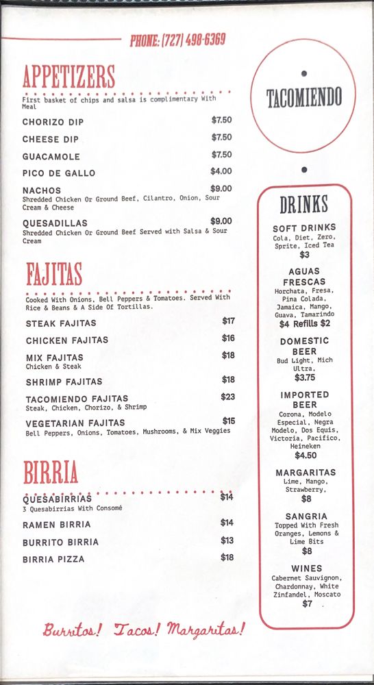 Welcome to Taco Miendo, a hidden gem nestled in Kenneth City, FL, serving up authentic Mexican cuisine with a modern twist. Their menu boasts delightful options like the popular Birria pizza, praised for its generous size and rich flavors, perfect for sharing. With complimentary chips and salsa offered upon arrival, each meal begins with a taste of tradition.